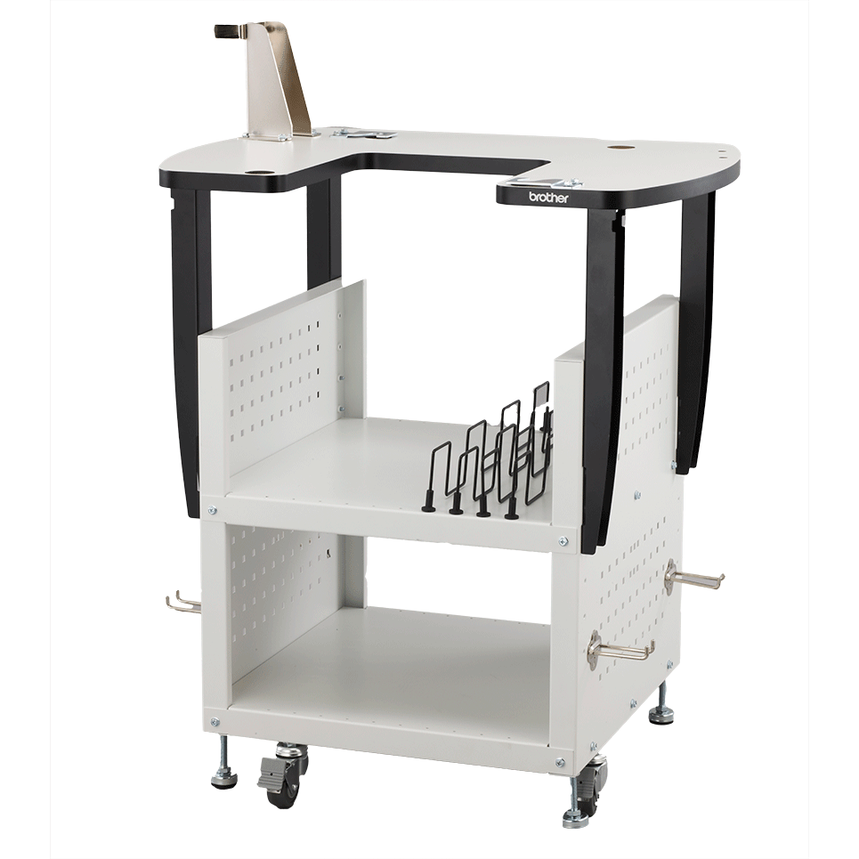 Secure your machine and store your frames and hoops with this metal stand for the PR and PRS Series. Designed for use with the Persona PRS100 and all PR-Series machines, this attractive metal stand helps provide a stable base for your machine. Similar to our PRNSTD stand (but modified for use with the PRS100, in addition to the PR1000 and PR600 Series), it has a wide table area with rounded edges and extra storage for all your large frames, such as the cap frame. The stand secures your machine with locks to resist vibration while in use. Locking wheels allow for easy moving and transportation, and the legs are height-adjustable. The stand has space for the cap frame, which is ideal for prepping hats for embroidery. The large shelf has supportive dividers for convenient hoop storage, and provides storage for accessories, instruction books and small supplies.