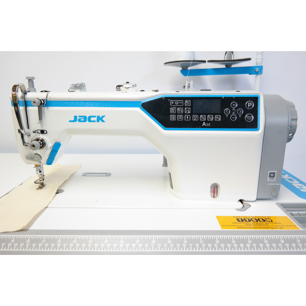 The Jack A5E is a high-speed, intelligent lockstitch industrial sewing machine designed for precision and versatility across various fabric types. It is an upgraded version of the classic Jack A5, featuring a significantly larger workspace and integrated AI technology.
